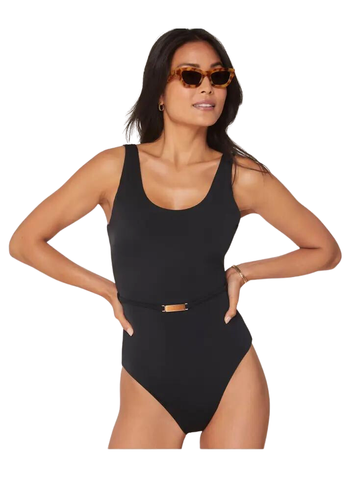 Sleek and flattering, this effortless one piece features a scoop neckline, removable belt, and medium leg cut.