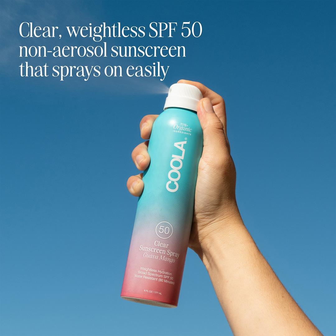A clear SPF 50 non-aerosol sunscreen that sprays on easily.
