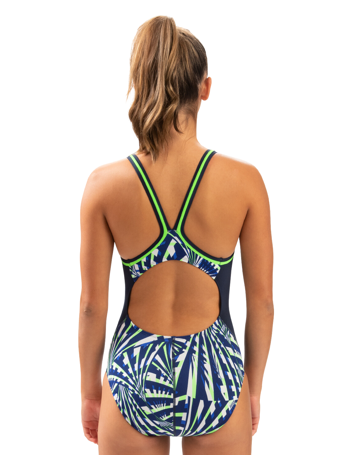 Feel unstoppable as you hit the water in this Atomic Blue Green DBX Back One Piece Swimsuit for women. With a fit perfect for competition you wont ever want to compete in anything else!