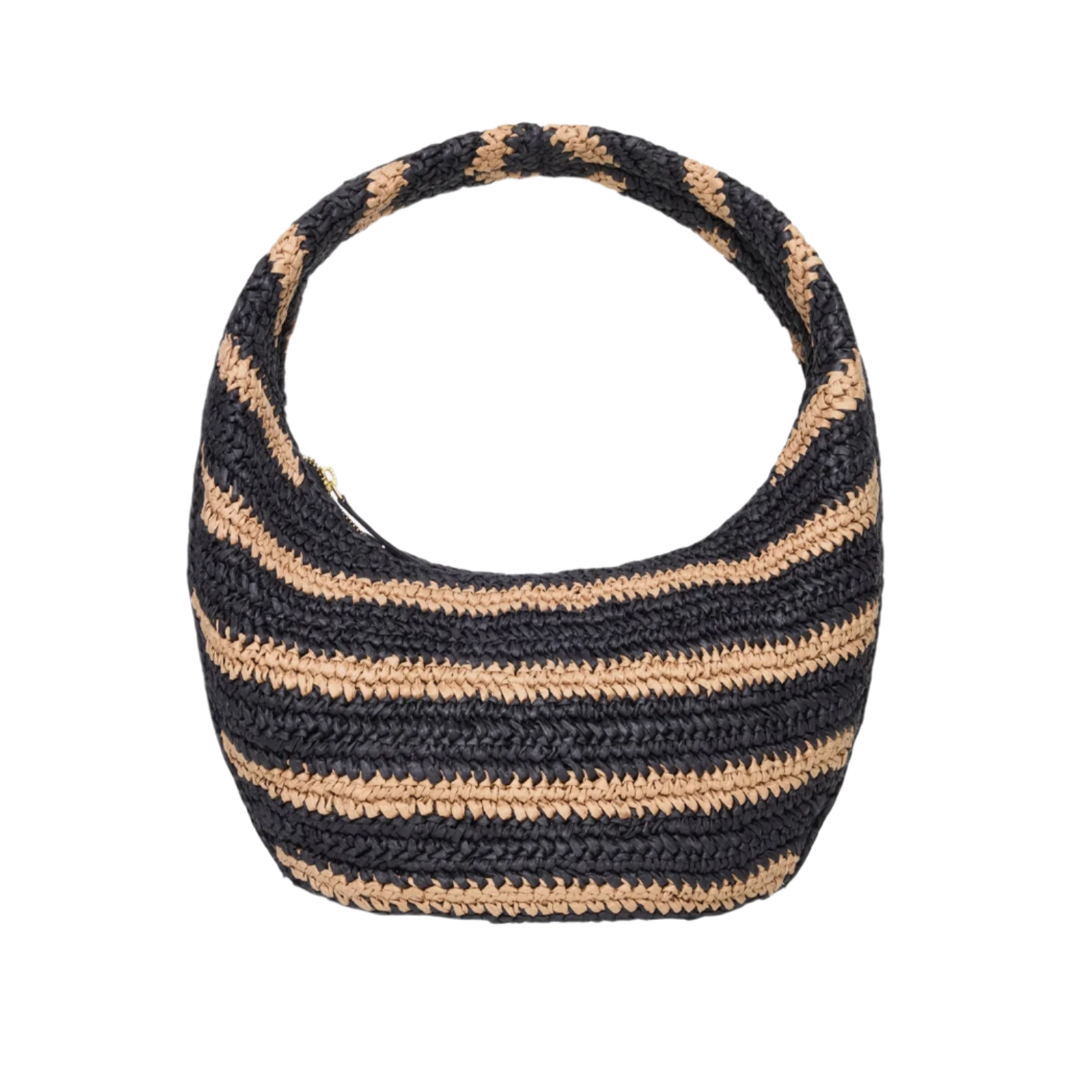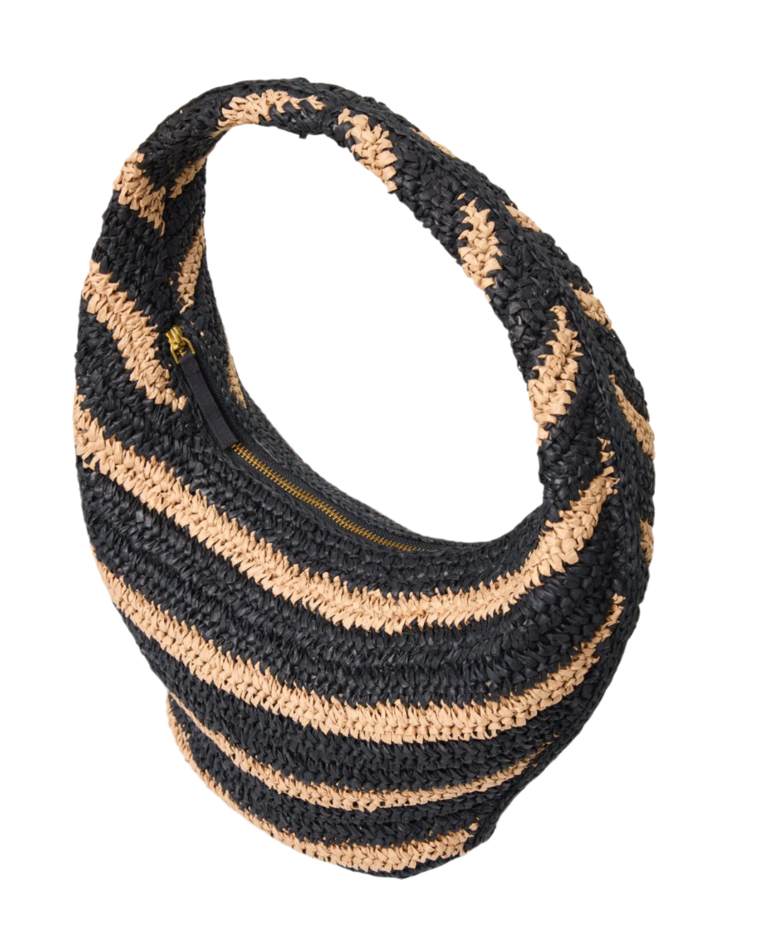 We're bringing things full circle with the Aya Bag. This slouchy moon-shaped paper raffia purse is fully-lined and has a functioning zipper to keep your things secure.