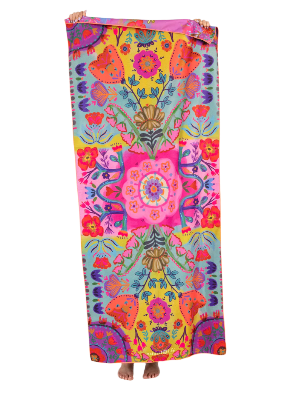 Two vibrant designs in one! Dries super fast and sand shakes right off! Perfect for the beach, camping, or yoga. Folds up small & compact