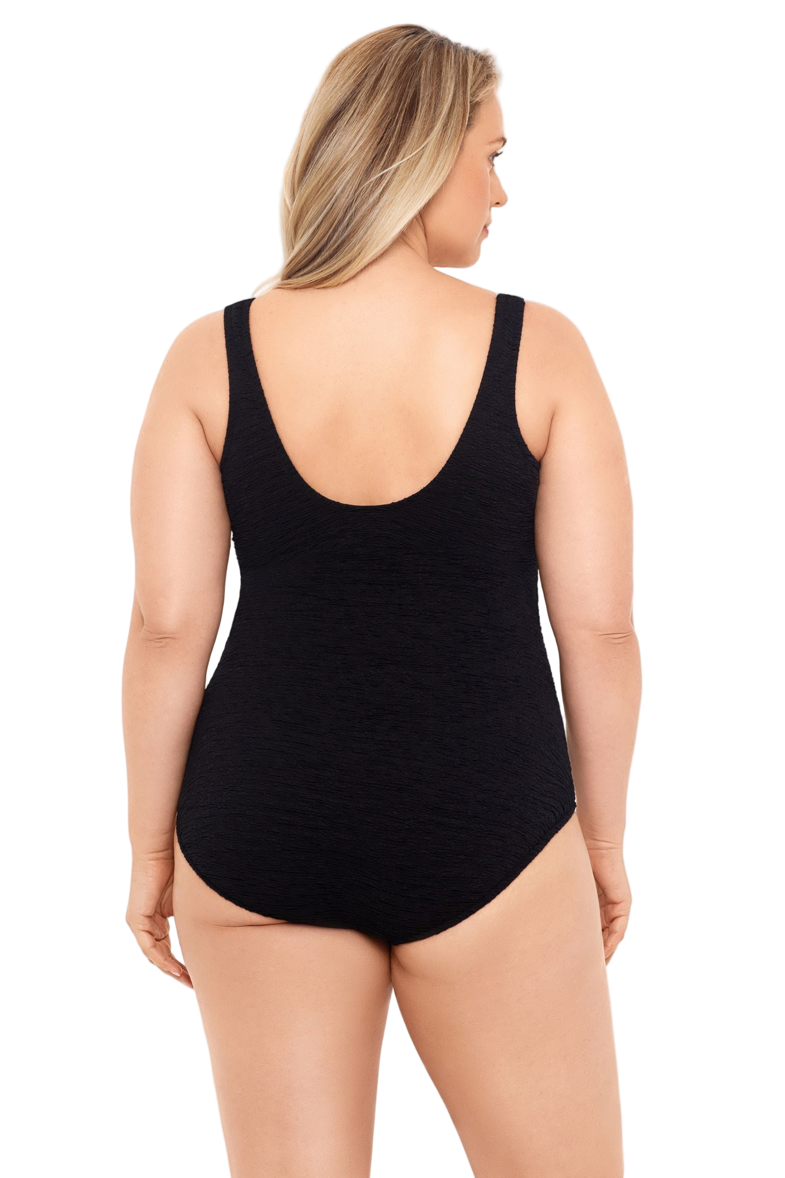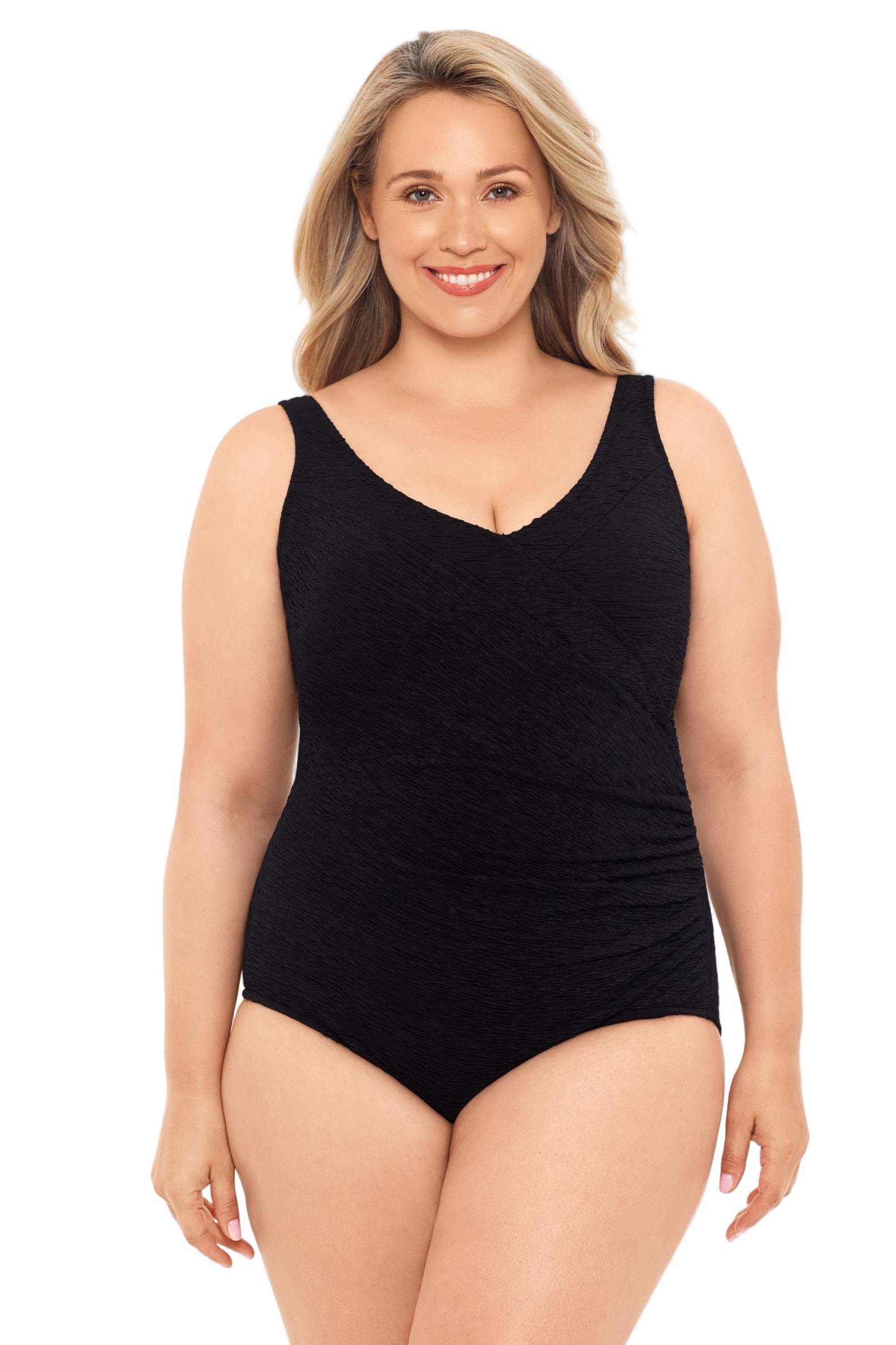 Penbrooke Krinkle Plus Size Chlorine Resistant Mock Surplice One Piece Swimsuit - Black