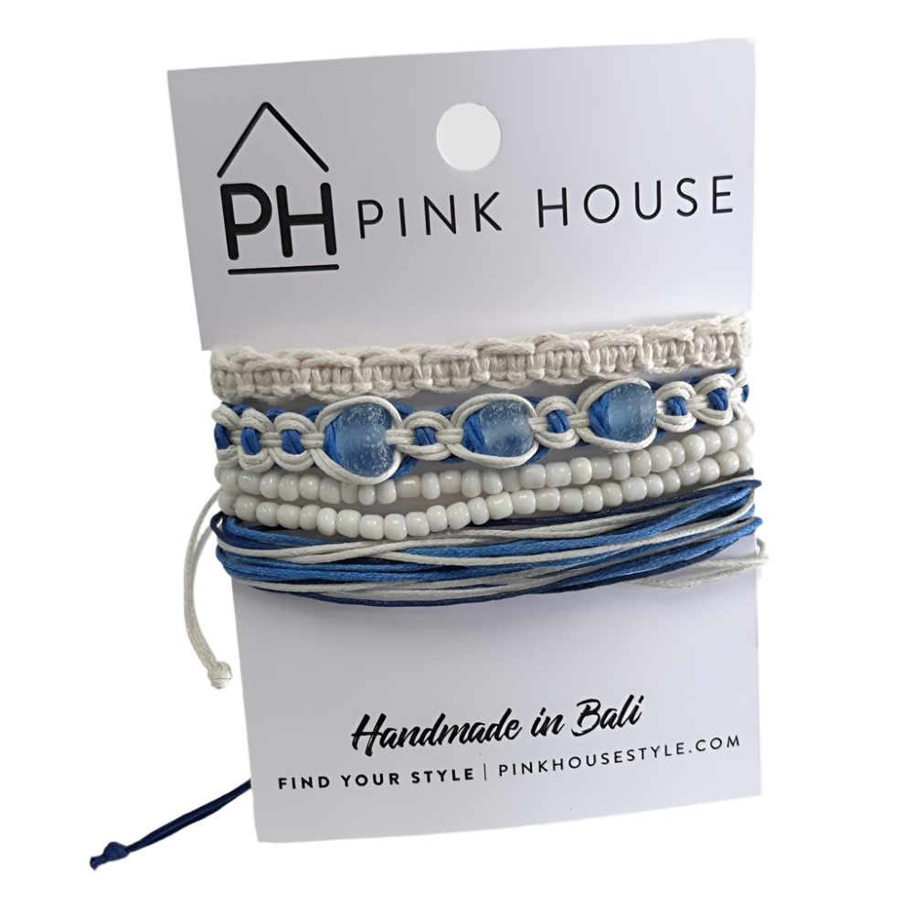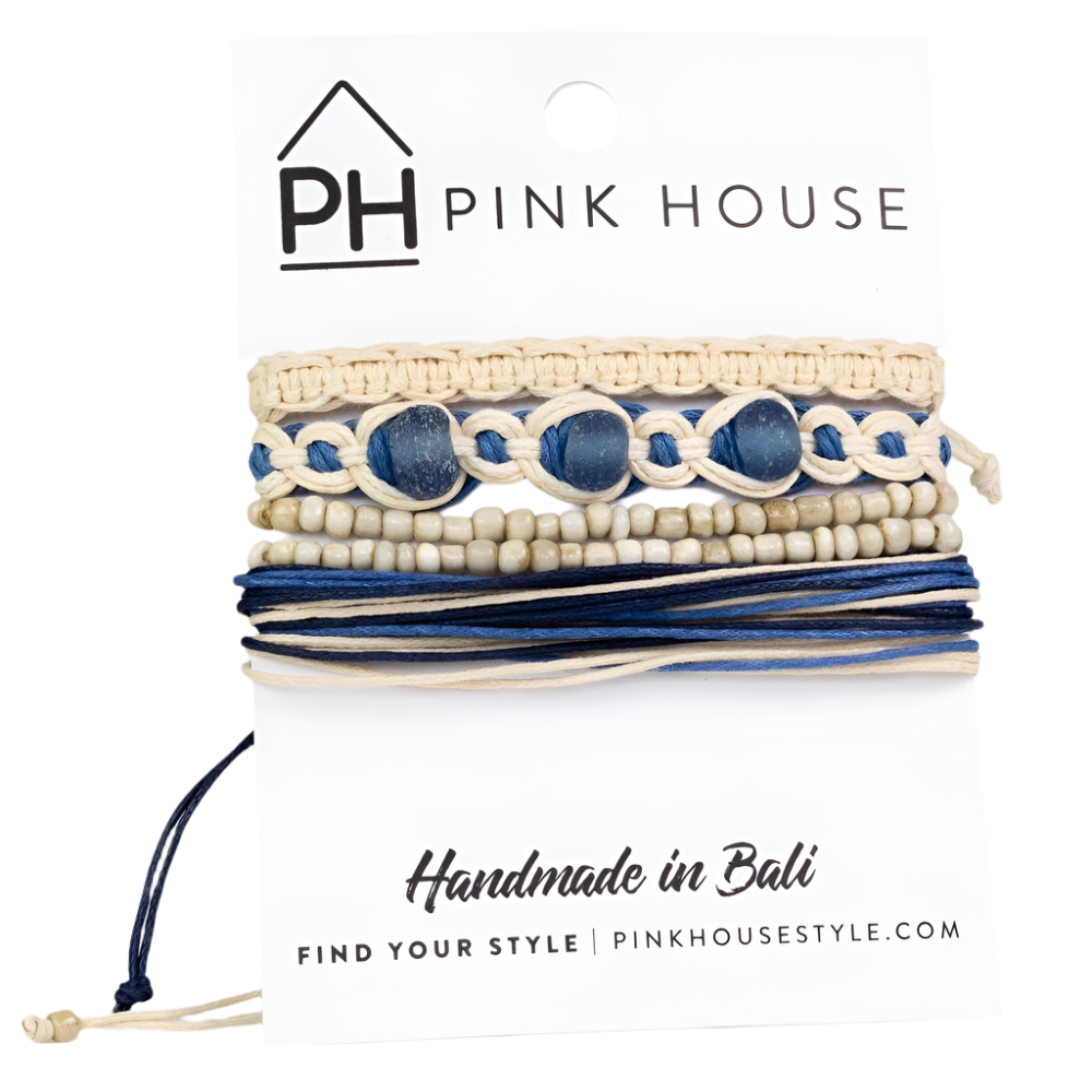 Transform your wrist with a touch of fun and color with the Pink House Color Stack Pull Bracelets! This set of 4 handcrafted bracelets features a sliding knot clasp for easy adjustment and can be worn together or individually for various styles. Handmade in Bali, these bracelets are the perfect addition to your accessory collection.