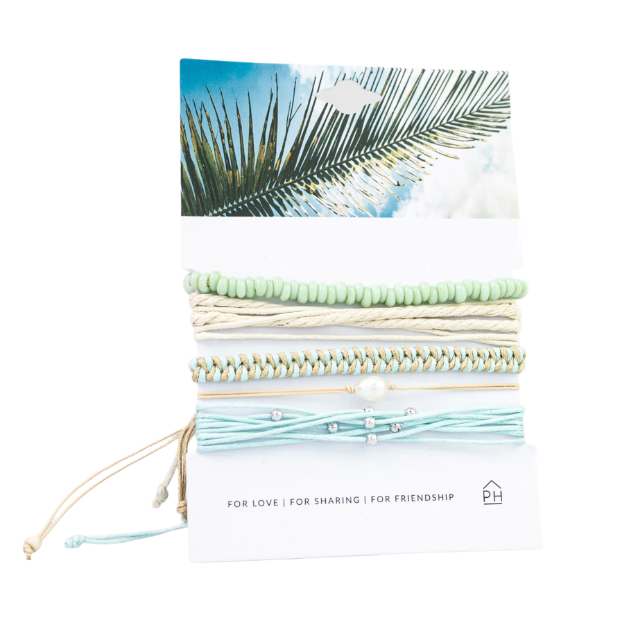Set of 5 handmade bracelets in complimentary tones. Wear them all together or mix and match for multiple looks. Sliding knot clasp easily adjusts to fit most wrists. Handmade in Bali.