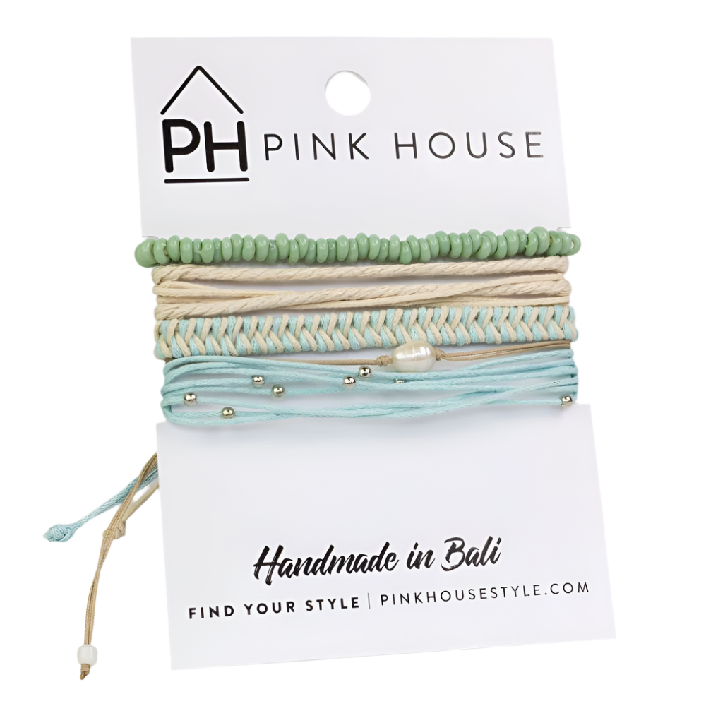 Transform your wrist with a touch of fun and color with the Pink House Color Stack Pull Bracelets! This set of 5 handcrafted bracelets features a sliding knot clasp for easy adjustment and can be worn together or individually for various styles. Handmade in Bali, these bracelets are the perfect addition to your accessory collection.