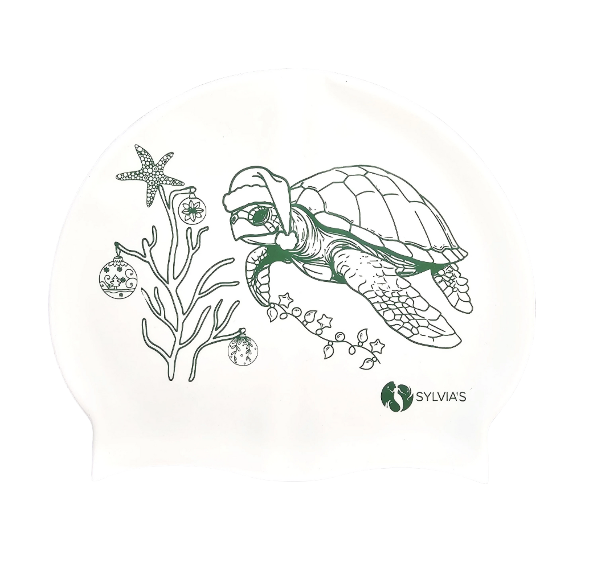 Celebrate the holidays by diving in with a modern line art Sea Turtle swim cap. High quality silicone construction ensures a compressive yet comfortable fit.