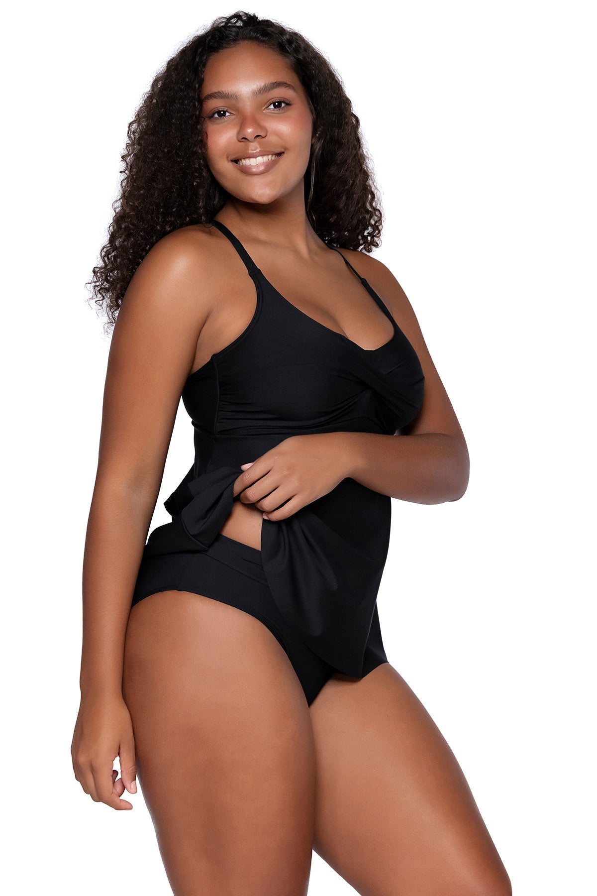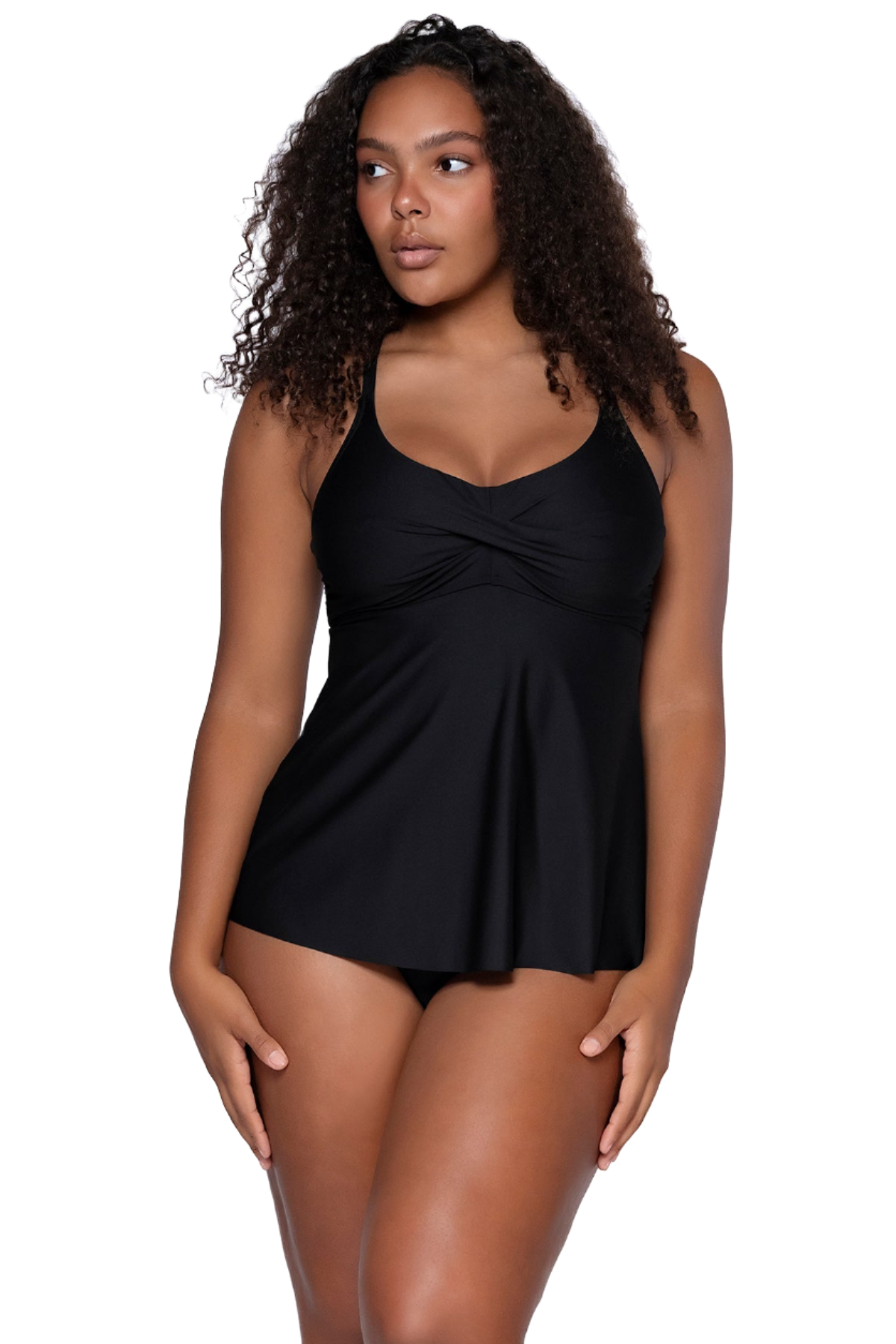 The Tori Tankini is the full coverage option for everyone that loves our Iconic Twist Bandeau. The delicate shirring and extravagant twist bodice are contrasted by a flowy, loose-fitting body. It also features removable cups, adjustable straps, convertible crossback, a hidden bra hook and eye closure, and boning. Coverage: Full. *Bottom sold separately. Fabric Content: 87% Recycled Nylon,13% Spandex