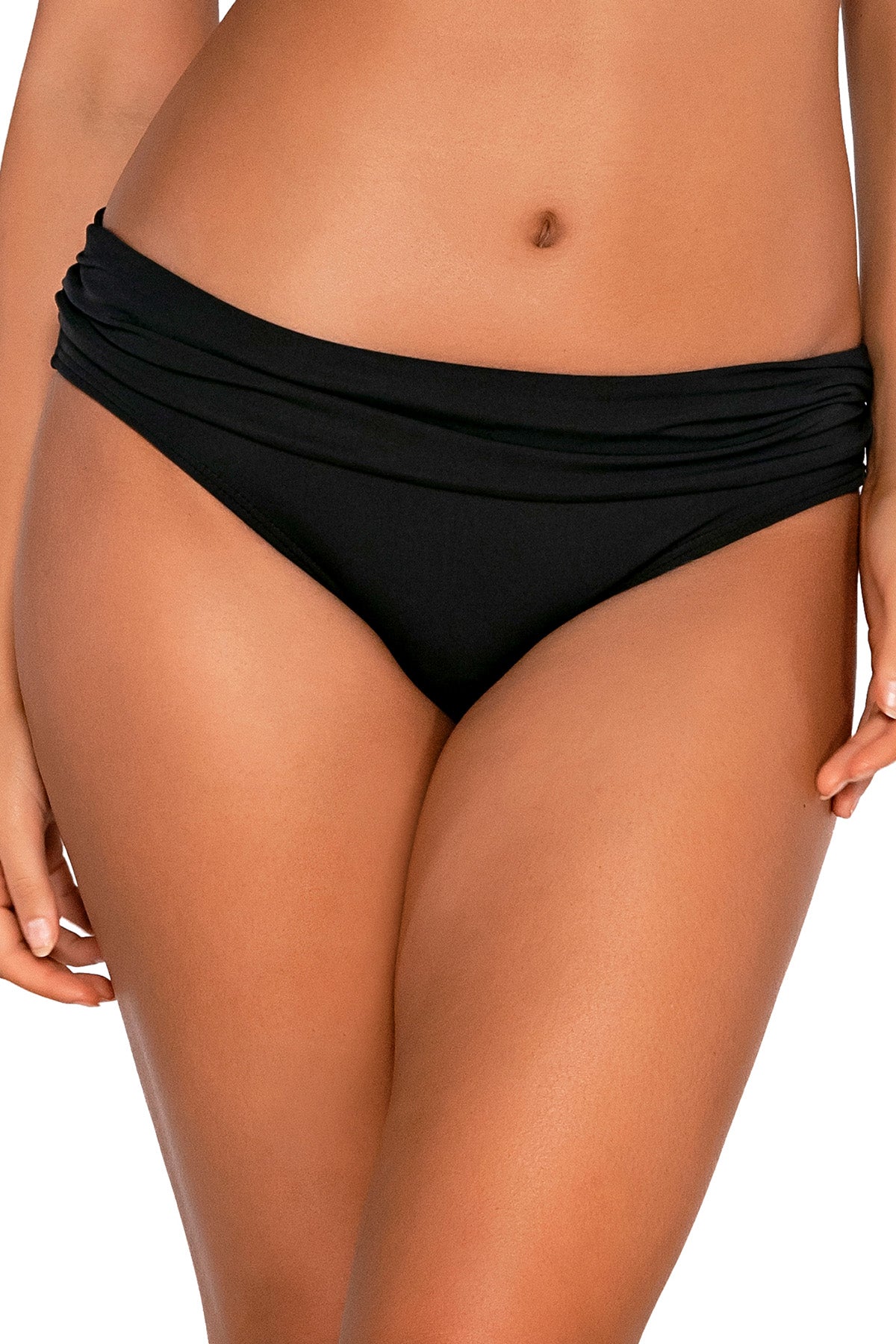 Add a little flair to your unforgettable bottom with our shirred waist hipster. Features include shirred band with cinched back detail and matching front and back colored lining. Sits straight across the hip.