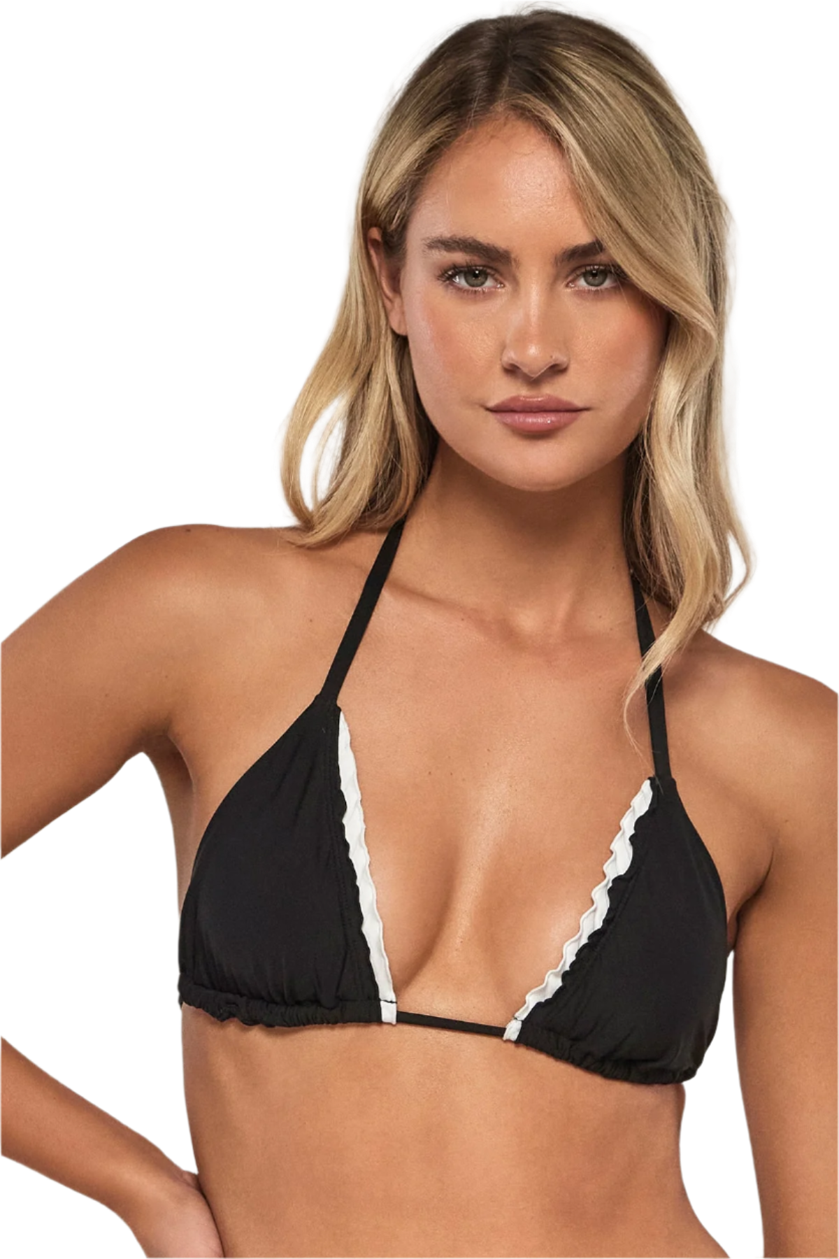 Get that double-layered look with this cute Cambria Triangle. Her contrast ruffle matches other colors in the collection. She has removable cups and wide string ties. In cup sizes, she has a double under bust band for added support.